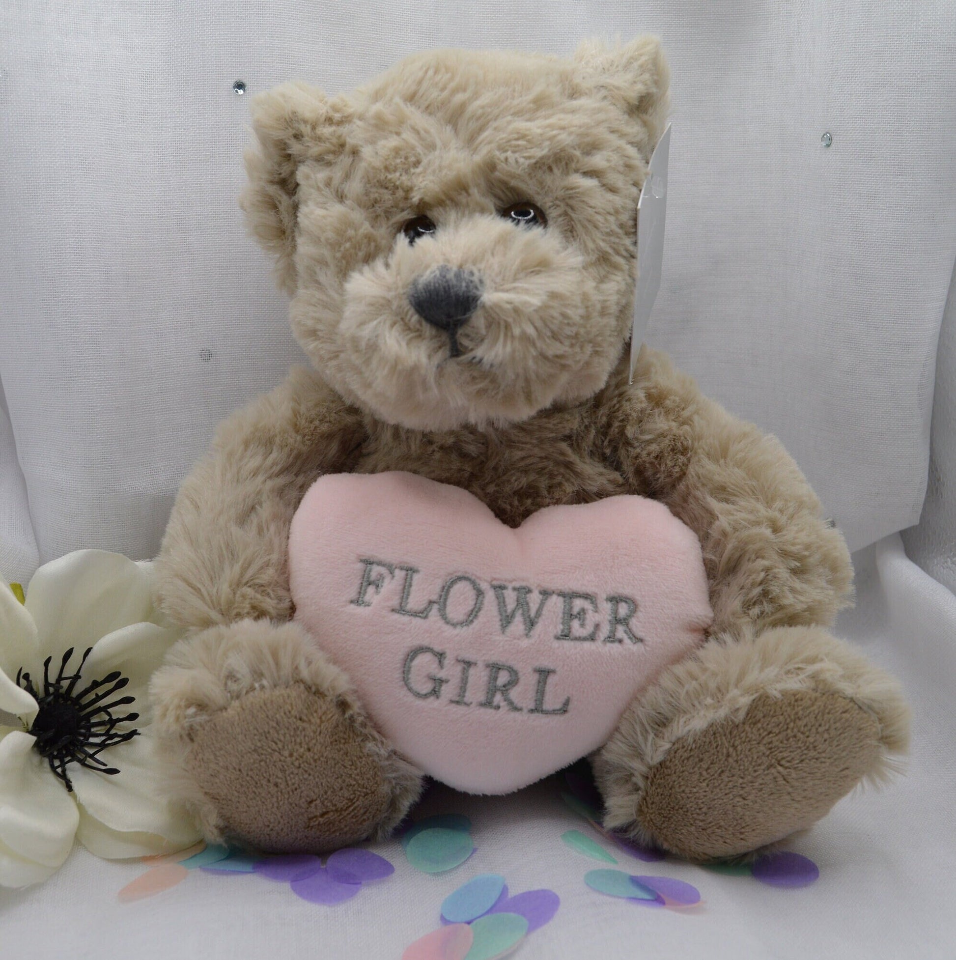 Soft Plush Teddy Bear Holding a Heart With Flower Girl Text
